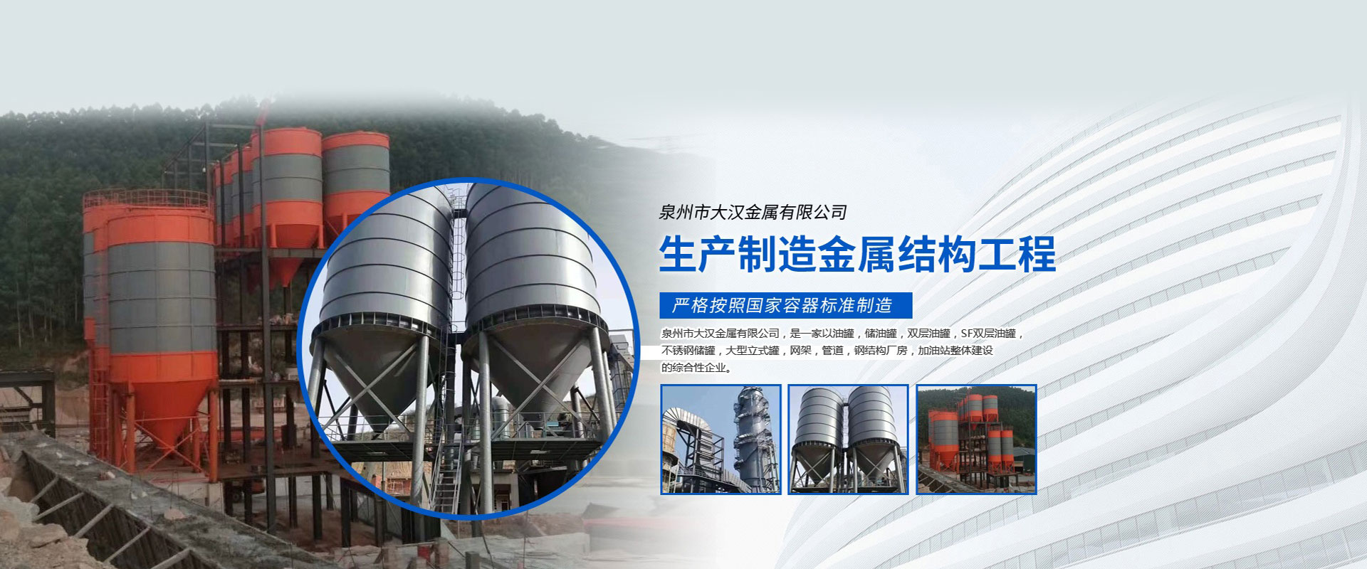 泉州市大漢金屬有限公司,是一家以油罐、儲油罐、雙層油罐、SF雙層油罐、不銹鋼儲罐、大型立式罐、網架、管道、鋼結構廠房、加油站整體建設的綜合性企業。本公司以技術人員、施工經驗豐富的工程隊、自動化設備、擁有鋼結構建筑、螺栓球網架設計安裝技術力量,嚴格按照國家容器標準制造,是一家產品開發并生產各種壓力容器和制造金屬結構工程,化工石油工程安裝的大型企業。近多年來,以質量穩定、客戶至上、信譽為本,以科技求發展,贏得廣大客戶支持與信賴。